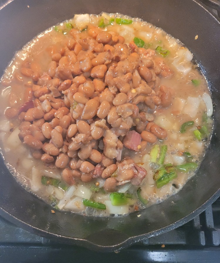 Since I keep these in jars in the fridge – the beans tend to soak up the water in the jar – cooking them I add about 1/4 cup of water to the skillet . . .