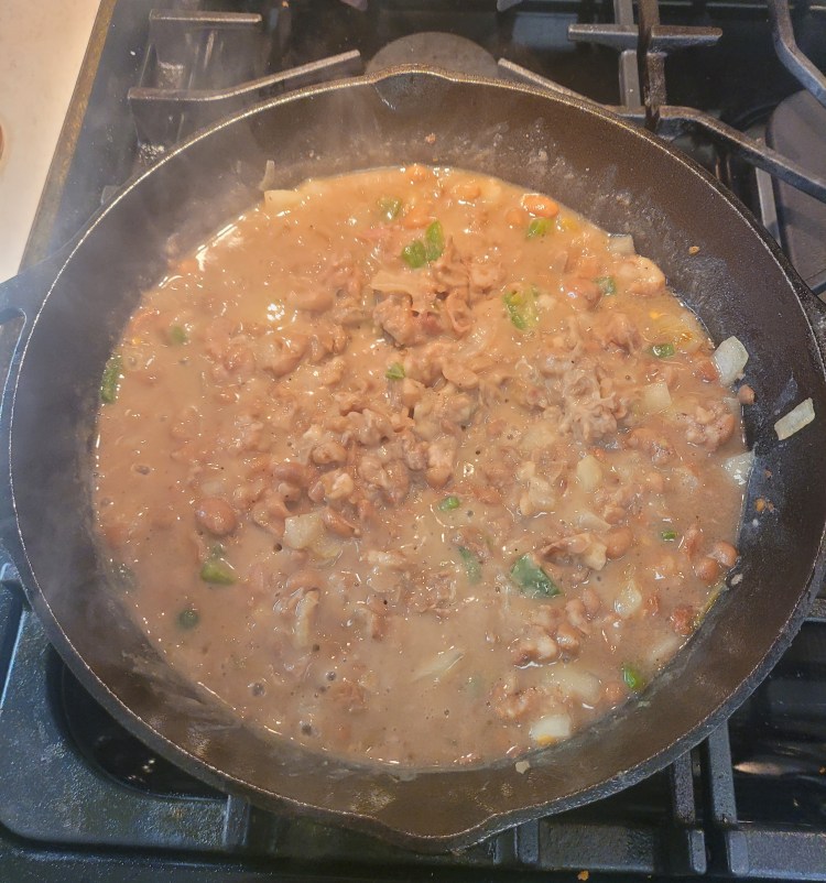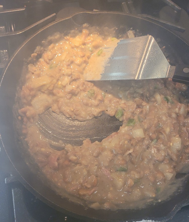In just a minute or three the beans are pretty much mashed / cooked and starting to steam off water and thicken . . .
