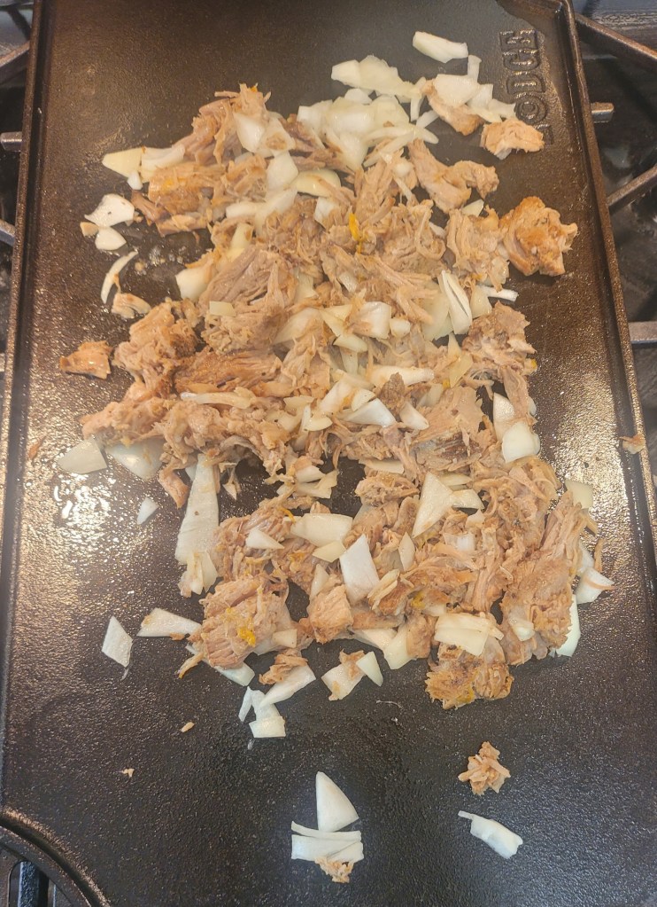 Besides just straight up eating them – let’s put them in a tortilla for lunch – remember I only used 1/2 that onion for the beans? Get the griddle hot – some avocado oil – the rest of the onion and a cup or so of pork carnitas – smelling good!