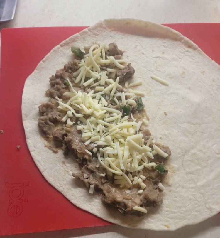 Put a layer of beans then cheese on 1/2 the tortilla . . .