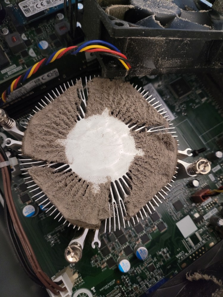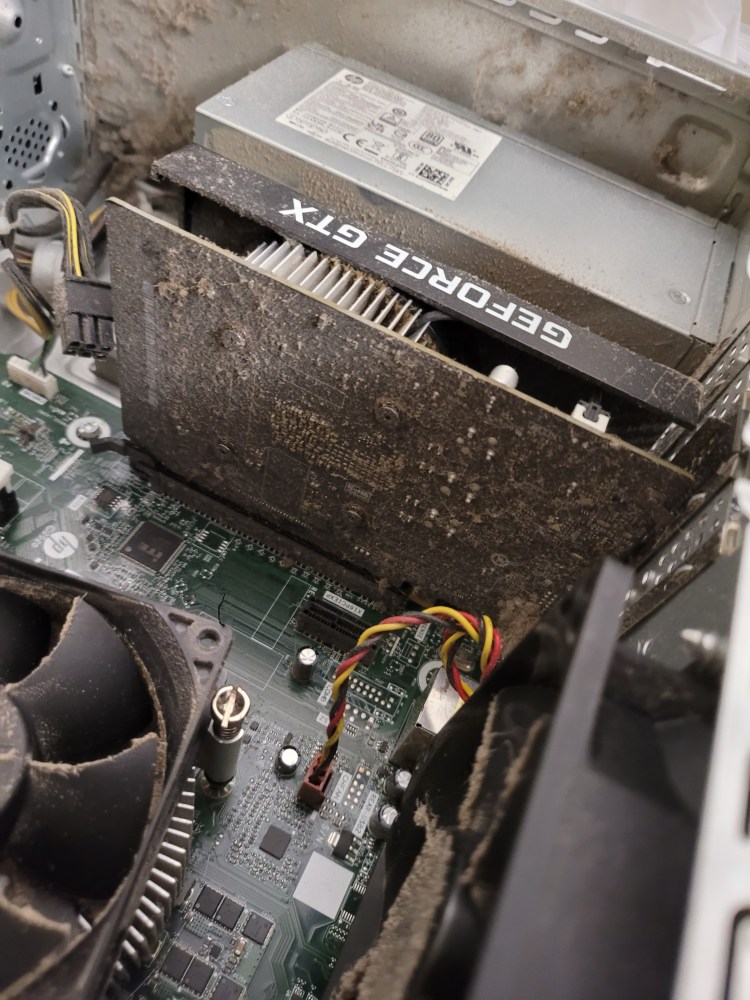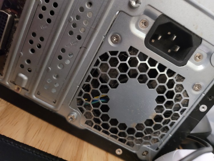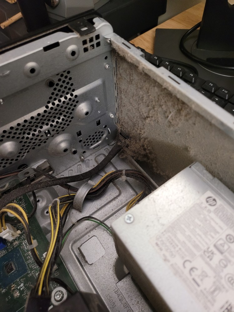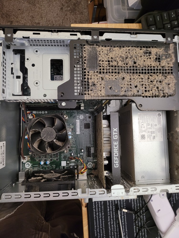 Took it all apart and attacked it – used not quite a full can of air – had the sneezing watery eye thing going for about 2 days. Hardest part? Pulled the power supply out and apart – getting the tiny fiddly cover screws for the power supply back in place really sucked.