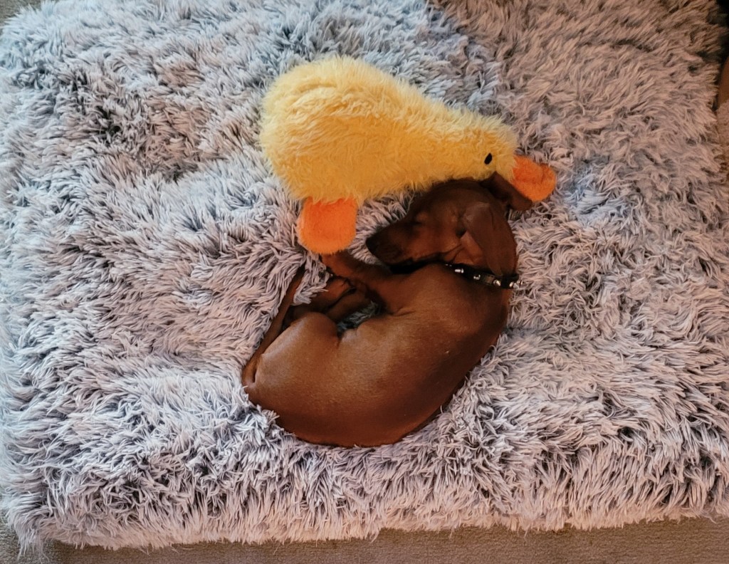 Me and Mr. Squeaky Duck wore him plumb out playing – he drug Mr. Squeaky Duck over to his bed and crashed – I slipped upstairs and grabbed these pics for you folks while Curtis was being a “Good Boy” – and he is always the bestest “Good Boy” when he’s asleep!
