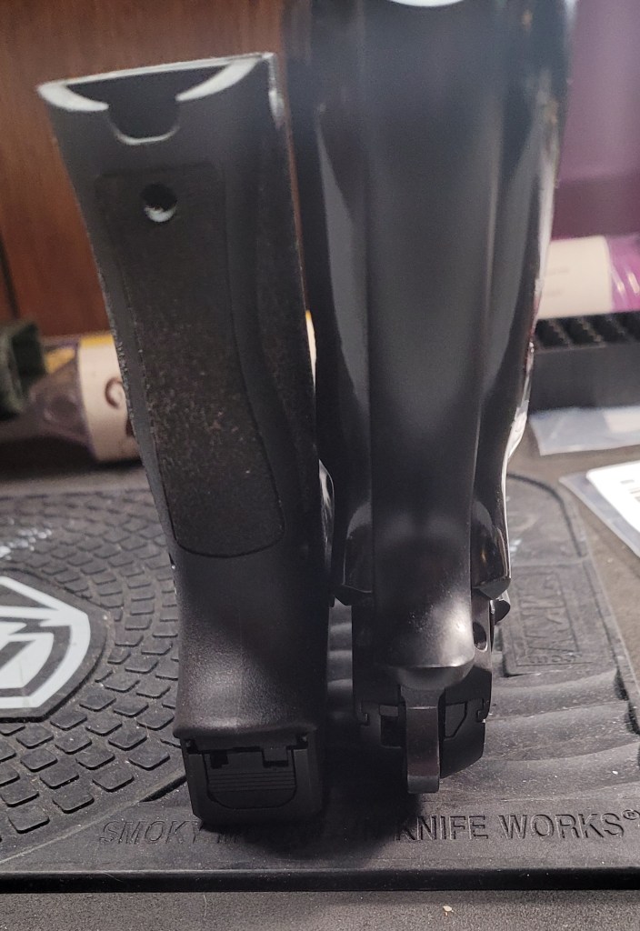 Front of the grip? The PSA has a slightly more under cut trigger guard and except for the little finger bump the front of the grip(s) are pretty much the same . . .