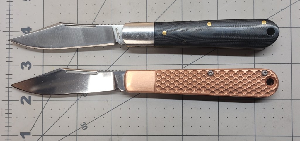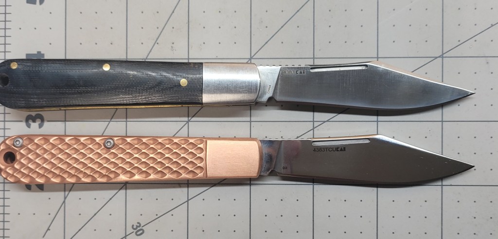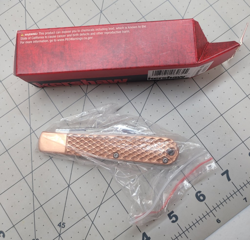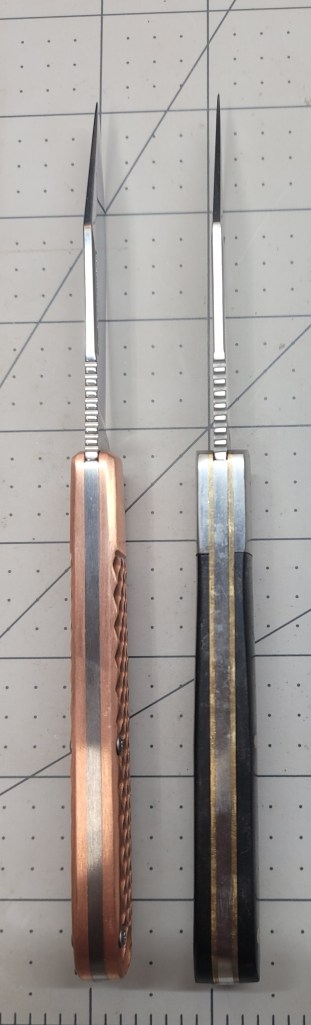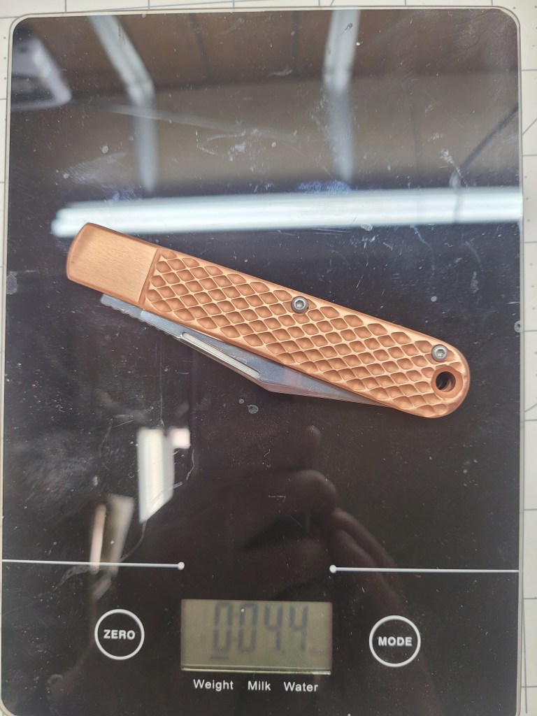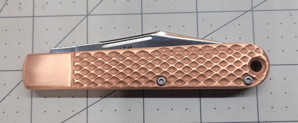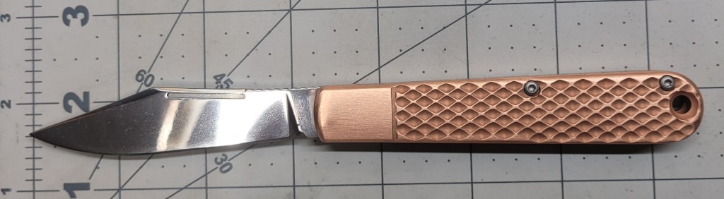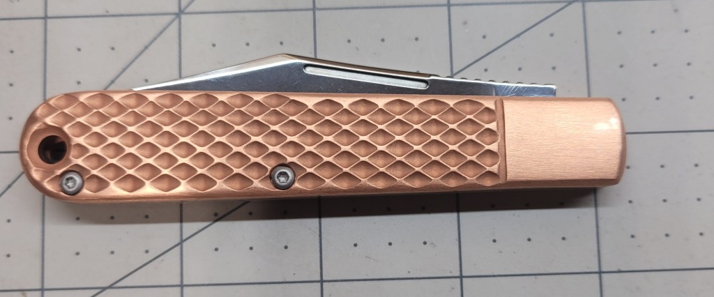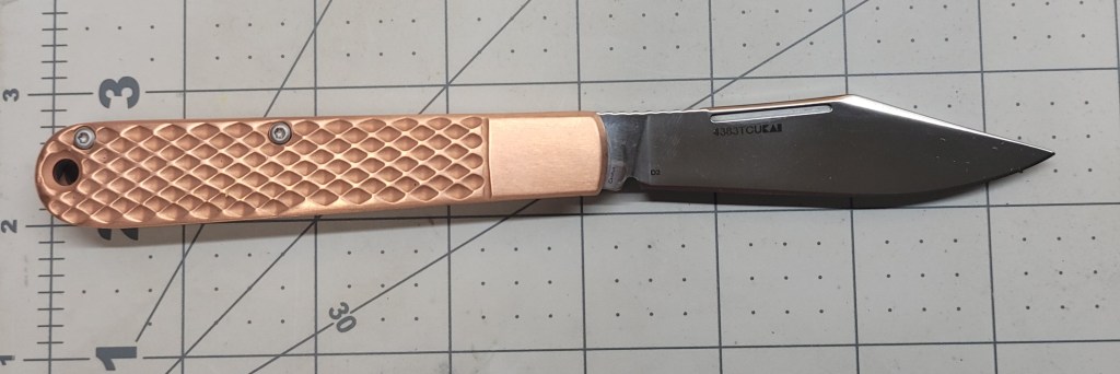 So where am I at with this? As a manual flipper it is easy to deploy – real smooth coming out – the ergonomics are good – the finger “grooves” work real well – good firm grip – the D2 steel blade is sharp AF right out of the box – 3 1/2 inch blade length is enough for most pocket knife “things”, and the copper scales are just off the chart . . .