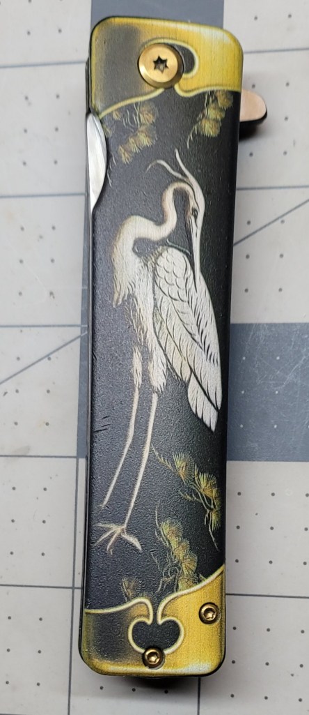 On the left side of the handle about halfway down the crane’s legs is the only blemish I could find anywhere on the knife – and the light has to be just right to see it – it took about 10 minutes of fiddling to get a picture of it – a bunch of folks handled it and never picked up on the blemish . . .