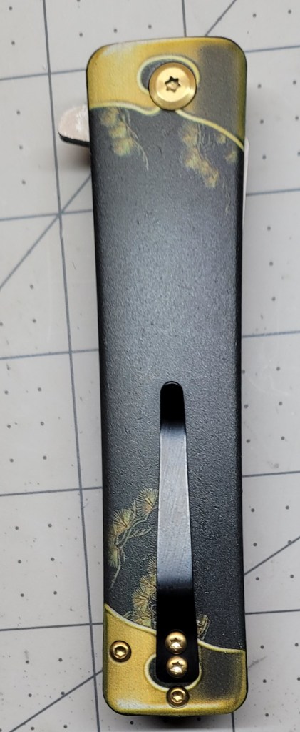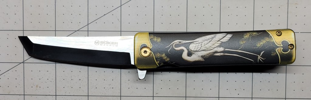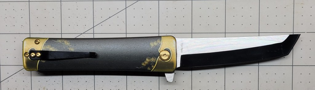 Very Japanese “looking” – between the pictures on the Zytel handles and the two tone pattern on the tanto blade – a very good looker . . .