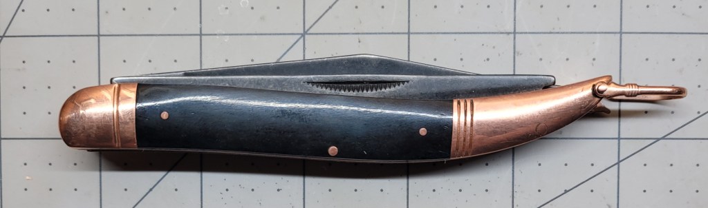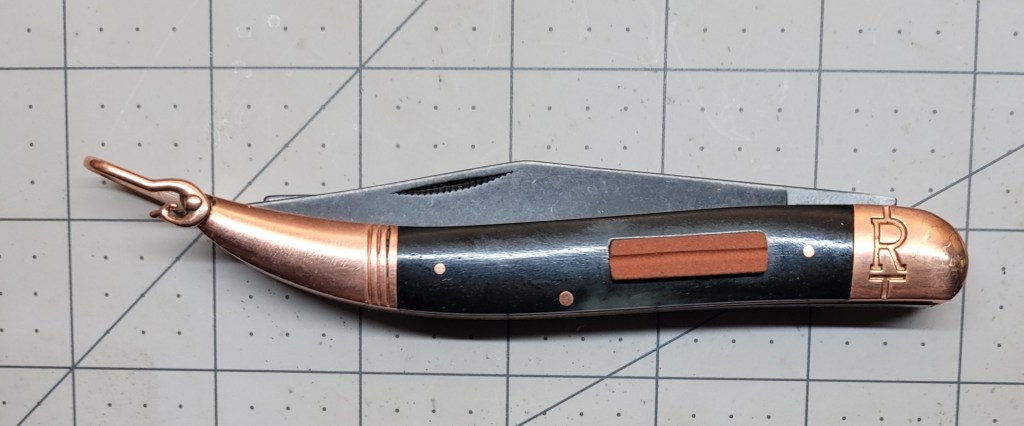 Good looking – the pictures don’t do it justice – smooth black bone – the copper bolsters – the copper bail shaped like a fish hook – and the hook sharpening stone just completes it visually . . .