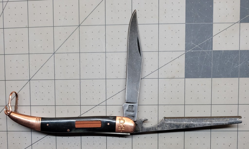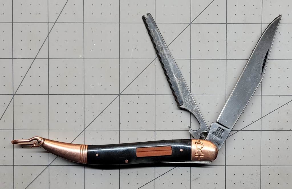 At $12.99 it is an incredible deal – The stonewash blades / black bone scales / and copper bolsters are just plain sweet – And there is the problem – I am not going to throw this in a tackle box – Nope ain’t gonna – Nor will I jam it in a pocket full of keys and other stuff – it’s way too nice to beat it up carrying it – but it sure looks good in the knife box!