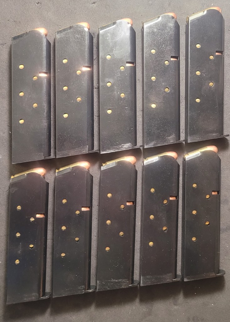 Get home and wipe the mags down – reload and into the range bag they go. Then bath time for the pistol – or if I shoot more than 1 – pistols – and ready for the next trip. 70 rounds lets me get into the zone to the point that when the trigger breaks I pretty much know where the shot is going to land. It took 3 to 5 hundred rounds each for my EDC Rock Island and the Colt M1991A1 to get to that point – I run 1 or 2 magazines in either one before I rotate it into carry – that’s about all it takes to get the “feel” for it once I burn one into muscle memory.